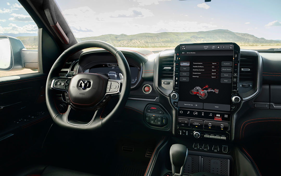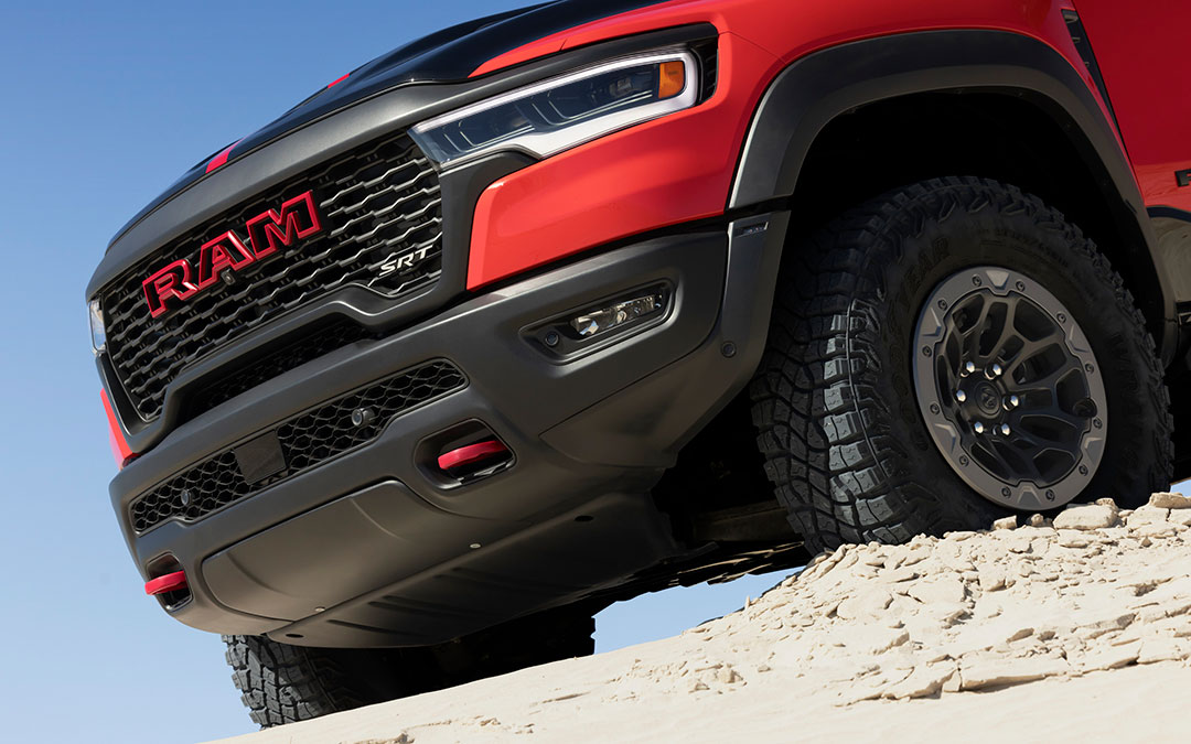 - La TRX recibe mejoras en forma de amortiguadores adaptativos Bilstein Black Hawk e2 de segunda generación, sistema Ram Active Terrain Dynamics y un recorrido máximo de suspensión de 14 pulgadas